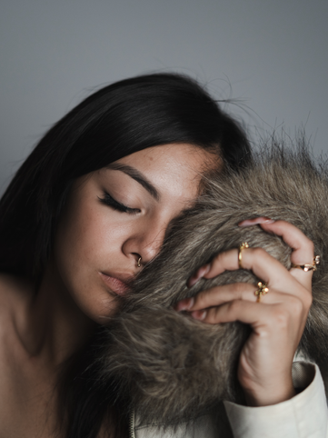 A handmade garment, the 'Flesh And Fur Jacket' jacket is displayed throughout the photo shoot, styled with two additional upcycled pieces; all by Savanneh Izel.